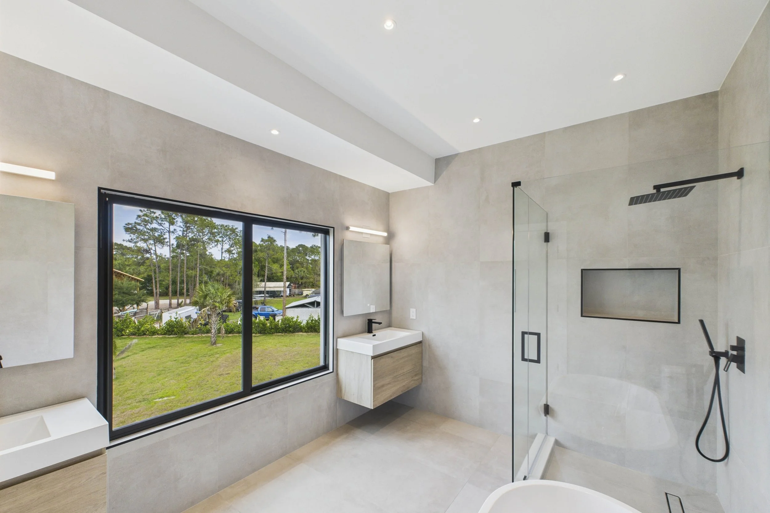 The bathrooms in this home exude modern elegance with monolithic porcelain tile that flows seamlessly from the floors to the walls, creating a sleek and cohesive design. Featuring floating vanities, modern luxury vanity lights, recessed lighting, and LED-lit vanity mirrors, every detail has been thoughtfully curated to deliver a spa-like experience.